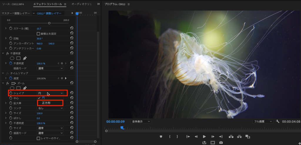 エフェクコントロールタブ内にあるズームの設定を変更していきます。デフォルトではシェイプが「円」になっていると思うので、それを「正方形」に変更します。