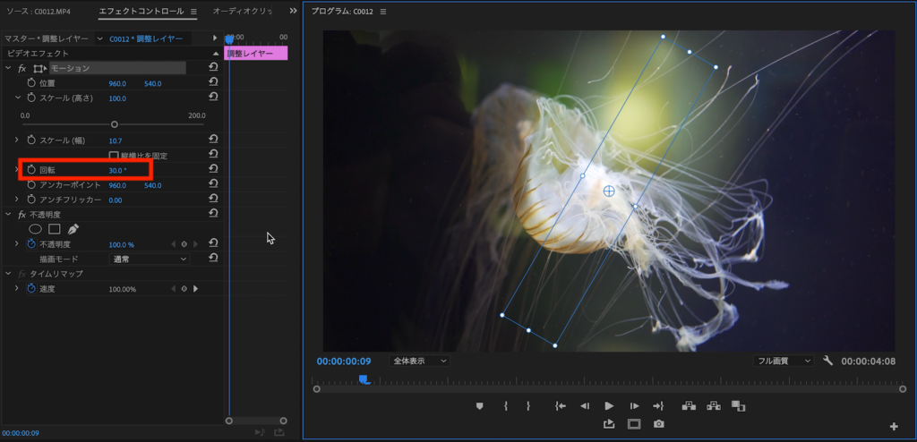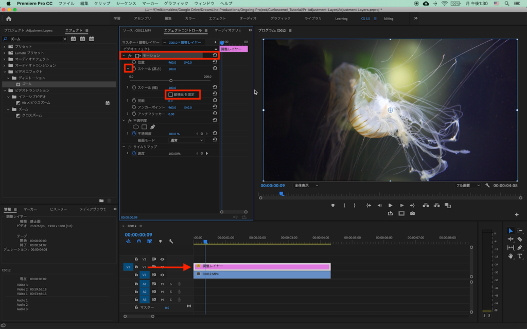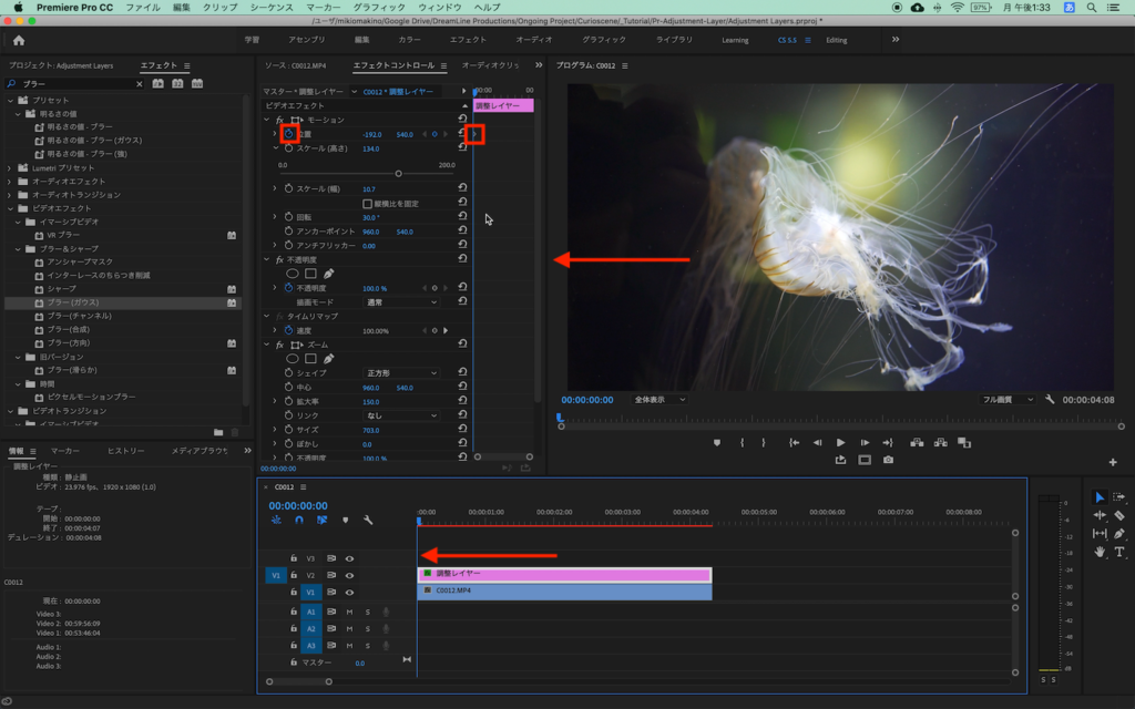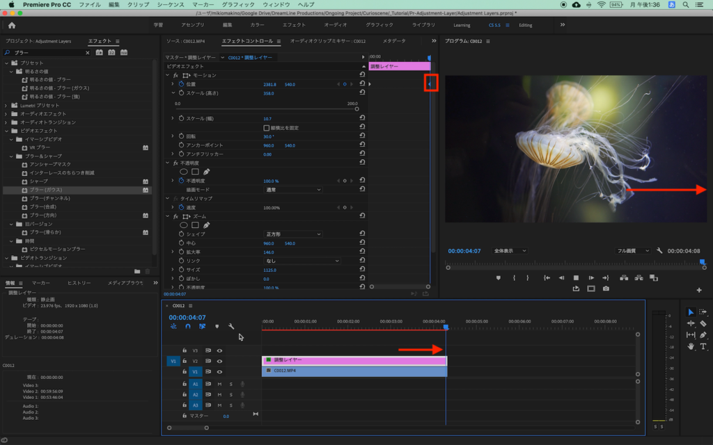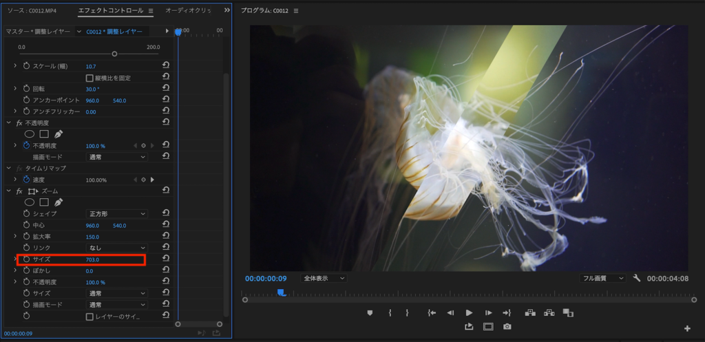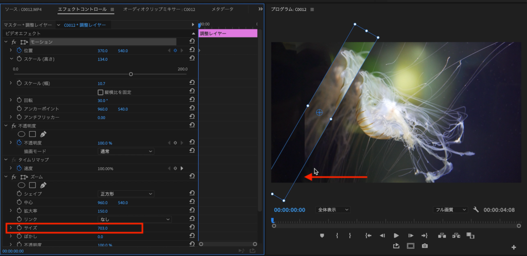 V3レイヤーに配置した調整レイヤーは好みに合わせてキーフレームまたはレイヤーそのものをずらしたりしてタイミングを変更したり、調整レイヤーのサイズやズームの数値を変更します。