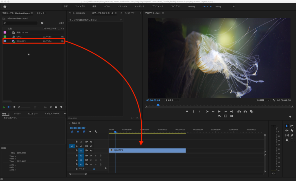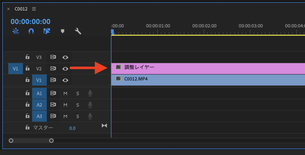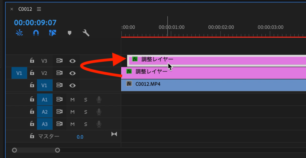 プロジェクトウィンドウに追加された調整レイヤーをクリップの真上に来るようにV2レイヤーに配置し、長さを調整します。