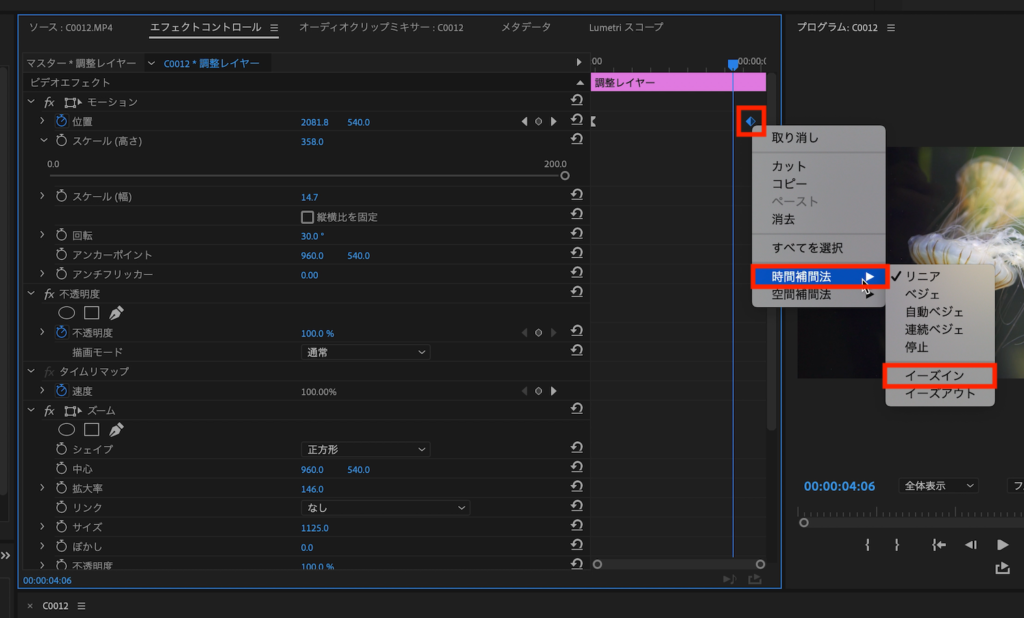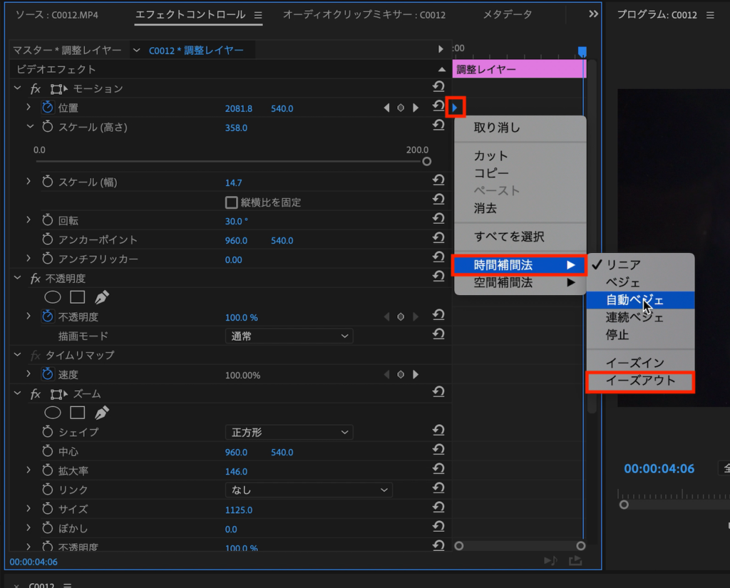 そしてV2/V3レイヤーにある調整レイヤーのキーフレームにイージングを追加していきます。キーフレームを選択して右クリック「時間補完法」から最初のキーフレームに「イーズアウト」、最後のキーフレームに「イーズイン」を追加します。