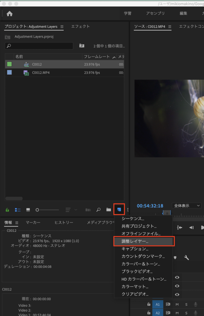 今度はプロジェクトウィンドウの「新規作成」アイコンから「調整レイヤー」を選択します。
