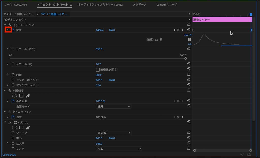 「位置」の三角アイコンをクリックし、グラフエディタを表示させ、速度の調整を行っていきます。