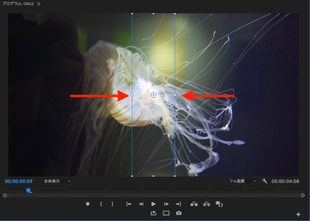 そしてタイムインディケーターをクリップの一番後ろに移動し、位置の数値を変更してフレーム外の右に行くようにキーフレームを追加します。
