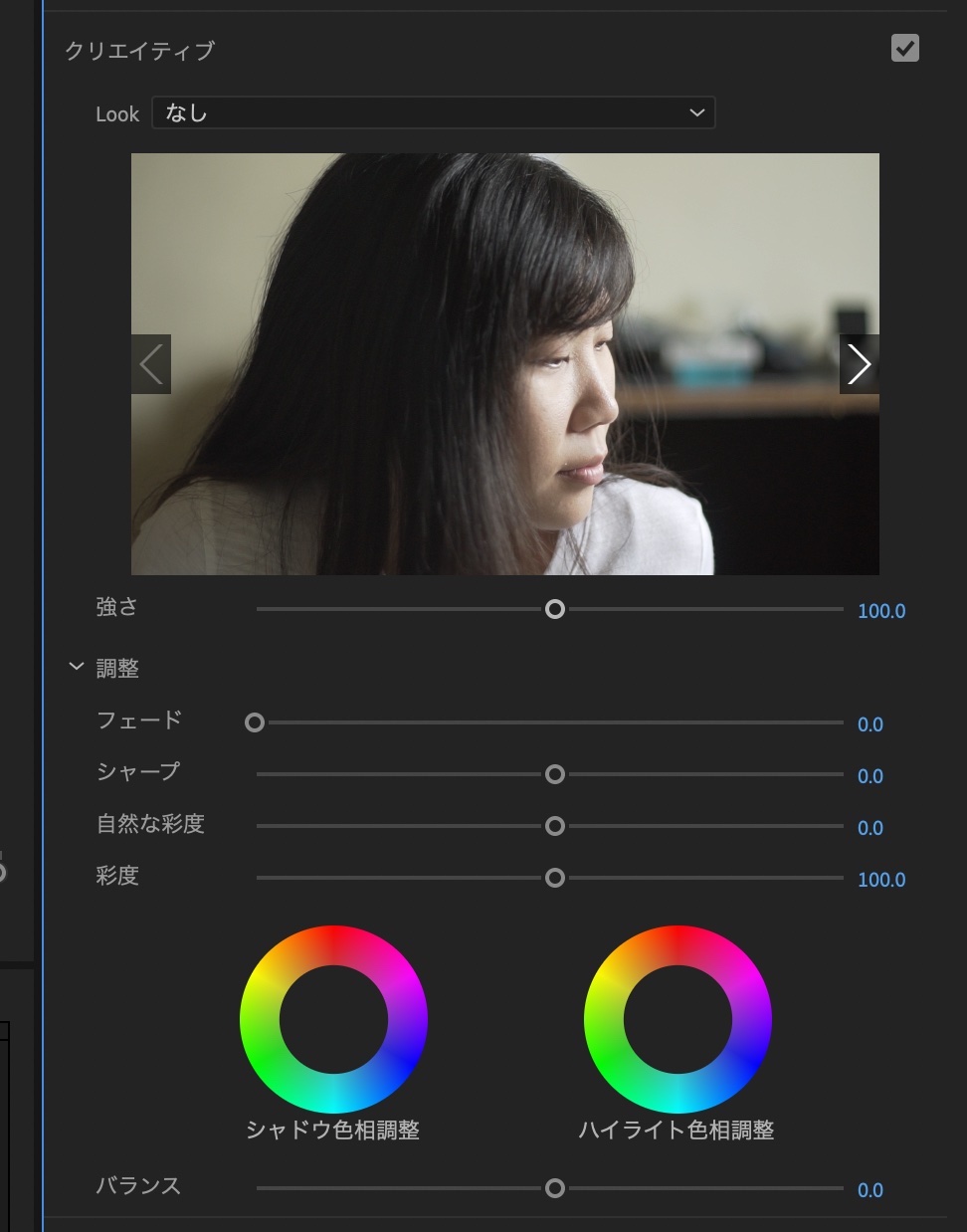 「クリエイティブ」では主にカラーグレーディングで使われる項目でクリエイティブLUT(Premiere ProではLook)、彩度やシャドウ、ハイライトの色相といった調整を行えます。