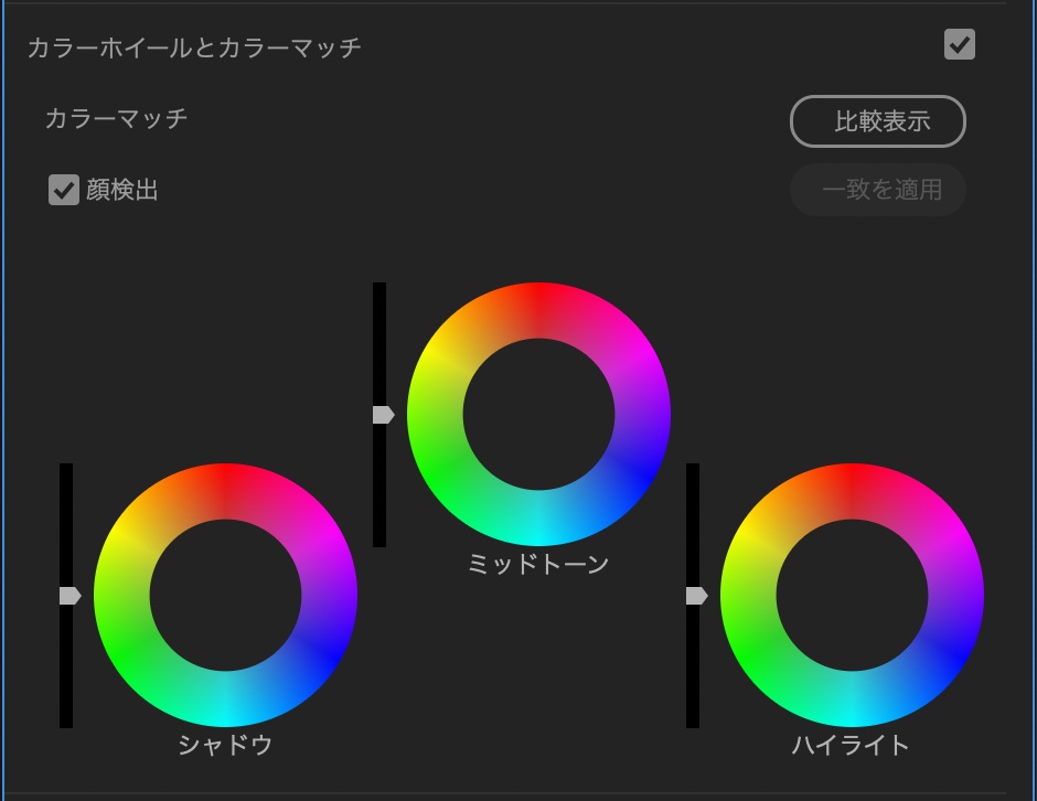 こちらではクリップの色補正をカラーホイールを使って調整できます。ホイールはシャドウ、ミッドトーン、ハイライトが用意されており、各エリアの色を調整していきます。左側にあるレバーは露出で、明るさも調整可能です。