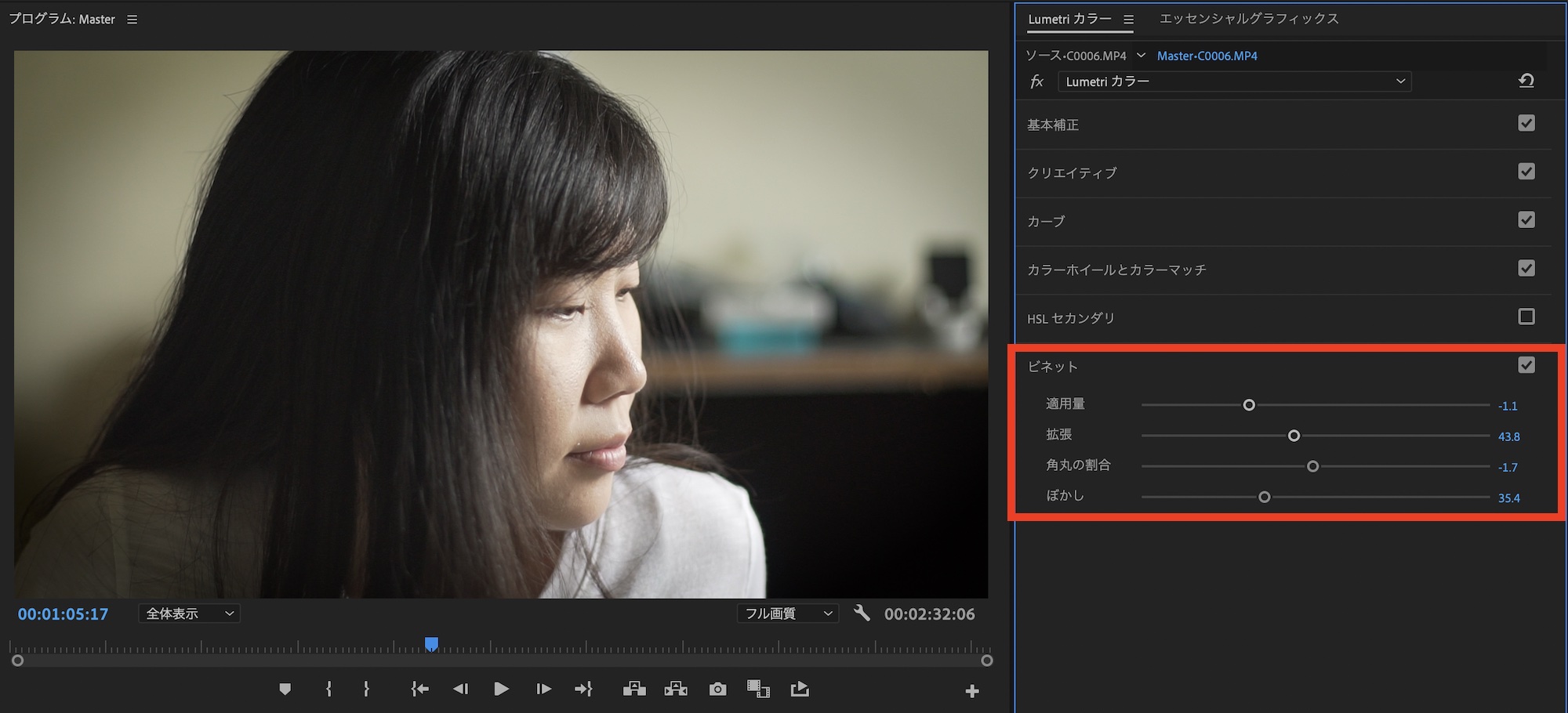 Premiere Proではホワイトバランスや明るさなどの基本補正に加えてRGBカーブやHSLの調整、ビネットなどの追加などをまとめて行える「Lumetriカラー」というビデオエフェクトが用意されており、クリップまたは調整レイヤーに追加することで色補正とグレーディングを行うことができます。
