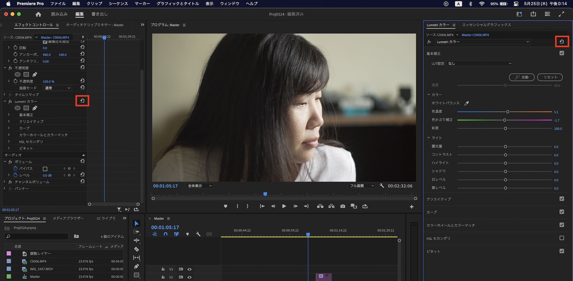 Lumetriカラーで調整したパラメータを全てリセットする場合は、エフェクトコントロールまたはLumetriカラータブにあるリセットアイコンをクリックするとパラメータが全て初期化されます。
