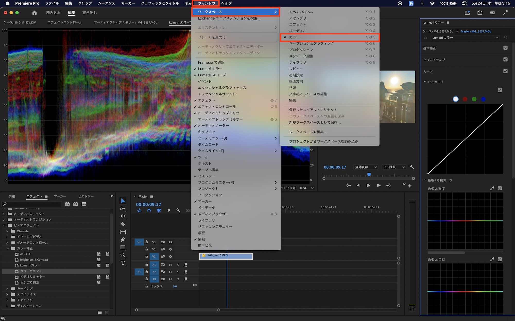 スコープやLumetriカラーを表示させるには上部メニューの「ウィンドウ」から「Lumetriスコープ」、「Lumetriカラー」をそれぞれ選択し、ウィンドウを追加するか、「ウィンドウ」の「ワークスペース」、「カラー」を選択し、色補正に特化したワークスペースに変更しましょう。