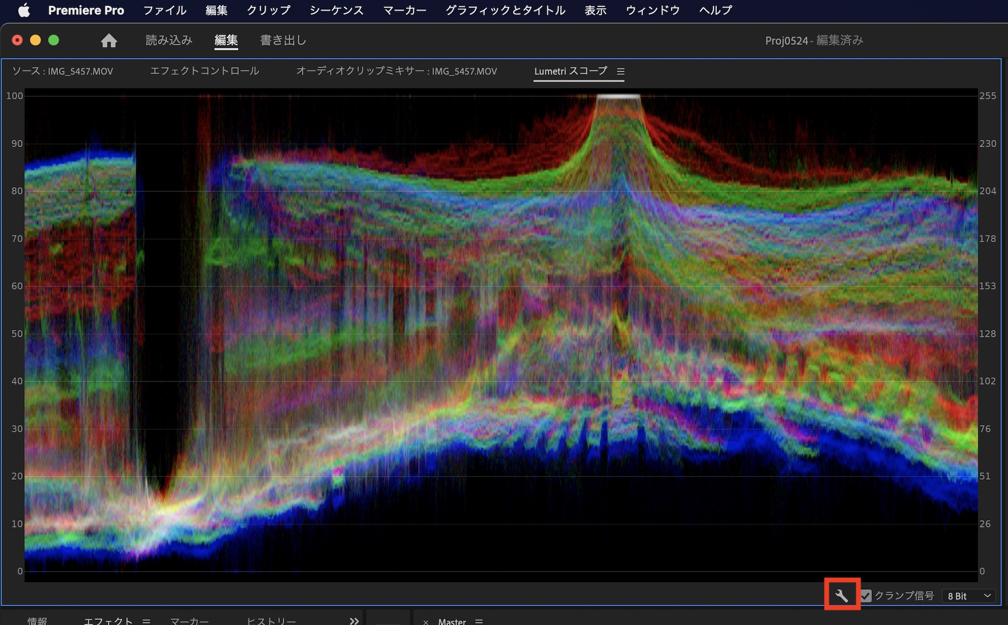 「Lumetriスコープ」では色補正に役立つRGBパレードやベクトルスコープを表示、切り替えができます。非表示やスコープの切り替えは右下にあるレンチのアイコンをクリックしましょう。