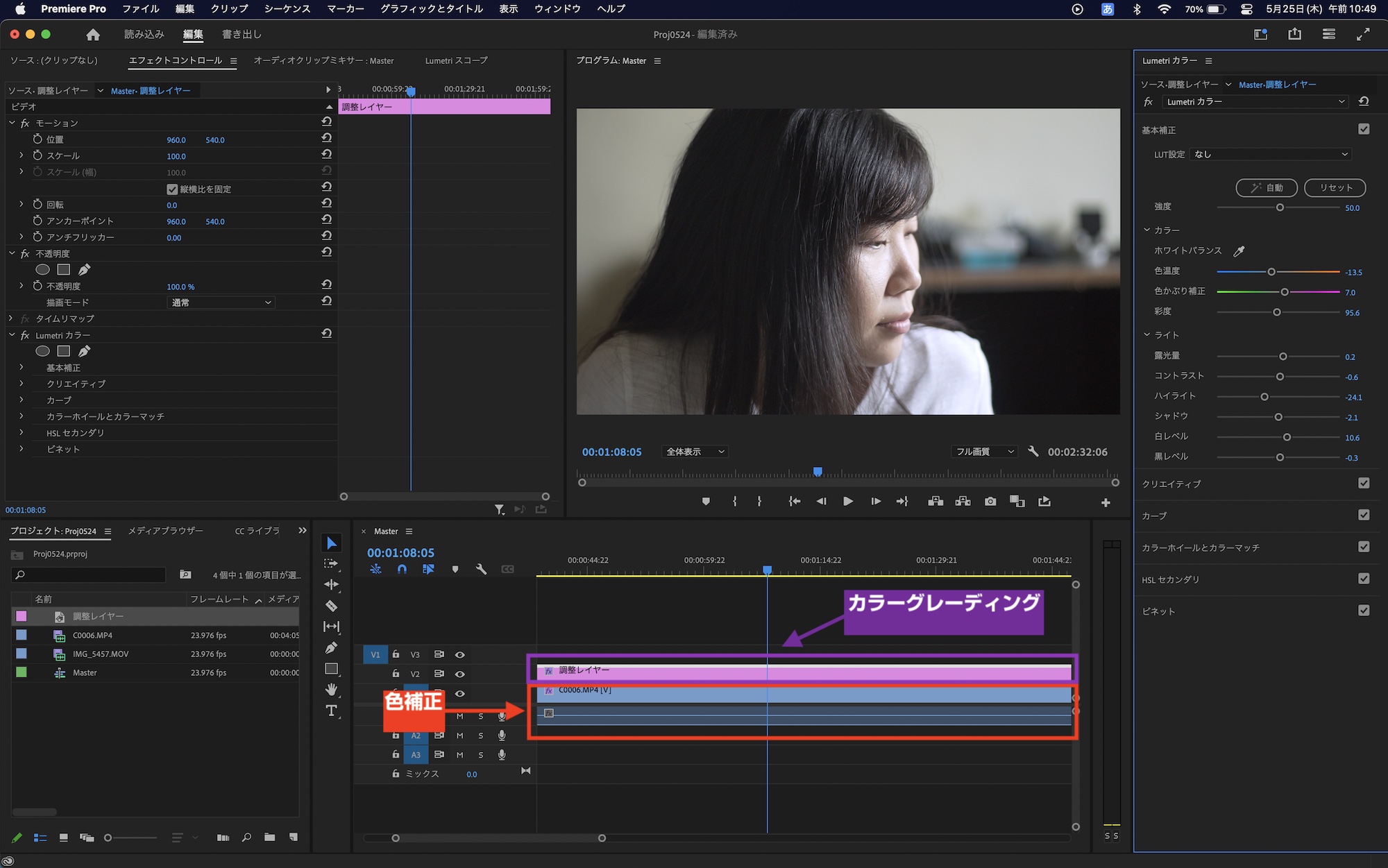 Lumetriカラーはビデオエフェクトなので、クリップにそのまま追加して色補正を行うことができます。しかし、カラーグレーディングを行う場合はグレーディング用のLumetriカラーをクリップではなく、調整レイヤーに追加するようにしましょう。