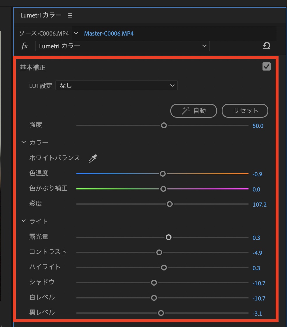 「自動」のボタンをクリックすることでPremiere Proが最適なホワイトバランスや明るさ、コントラストなどを自動で調整してくれます。ただし、自動と言っても完璧ではないので、下の「カラー」と「ライト」のパラメータを操作して微調整しましょう。