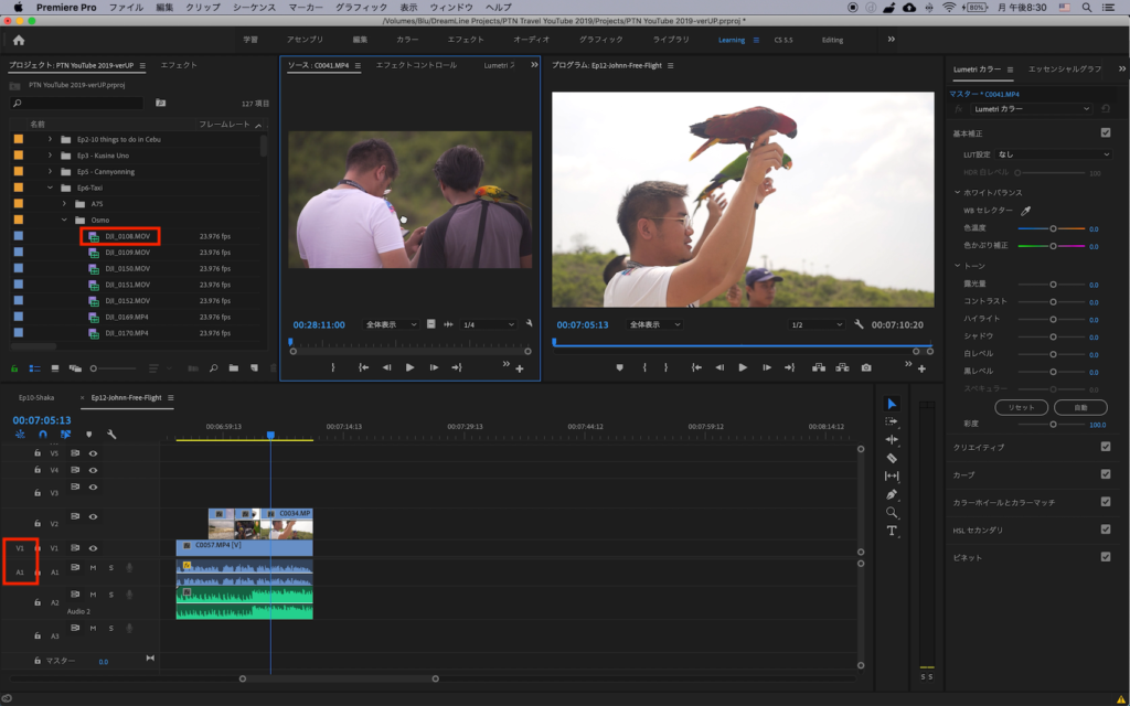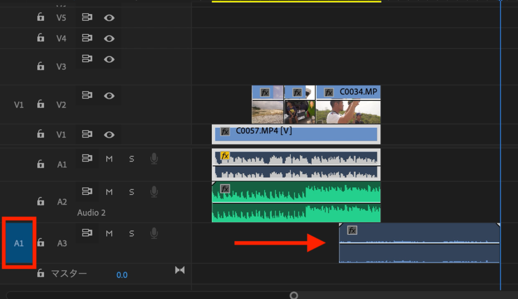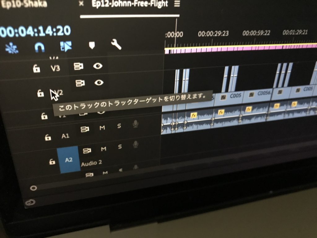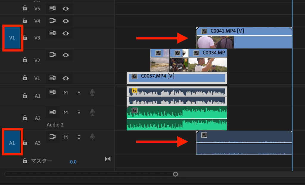 映像編集をする前はターゲットトラックに問題がないように、それぞれ「V1/A1」を選択した上で編集に取り掛かり、必要に応じて変更しておくと良いでしょう。そのほうが特に問題もなく、スムーズに作業できると思います。