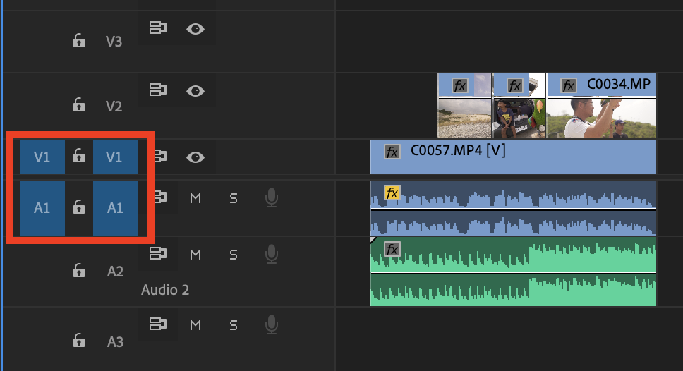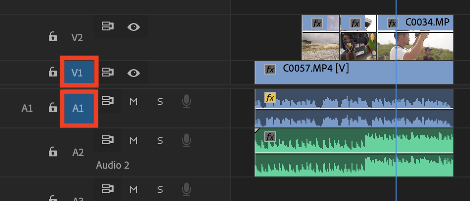 まずシーケンスの一番左側にあるエリアを確認してみてください。V1、V2、A1、A2と並んでいる部分にマウスをオーバーすると「このトラックのトラックターゲットを切り替えます」と表示されます。