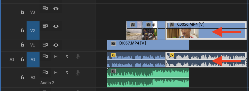 下のシーケンスを例にしてみるとクリップと音声ファイルがそれぞれレイヤーV1、V2、A1、A2に配置してあるとします。