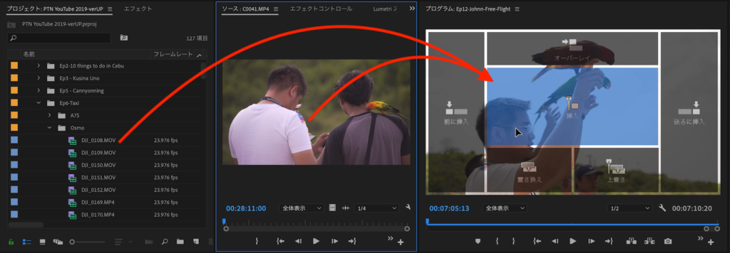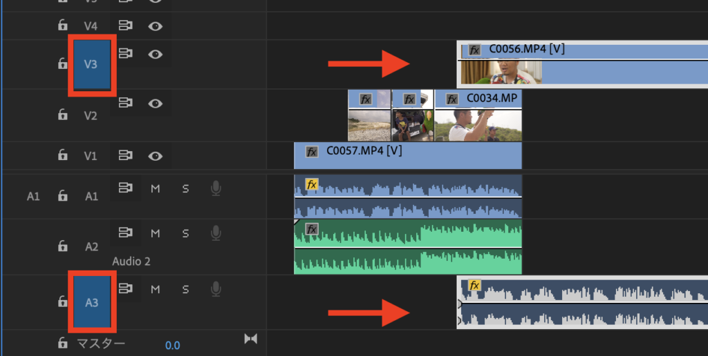 上のシーケンスを例にしてみると、V3/A3にターゲットした状態であればV1、V2、A1、A2にある素材に影響を与えることなく、3つ目のレイヤーに追加することができました。