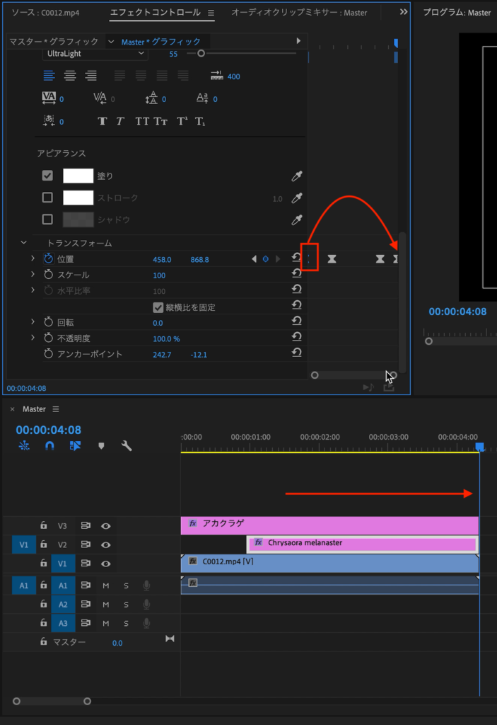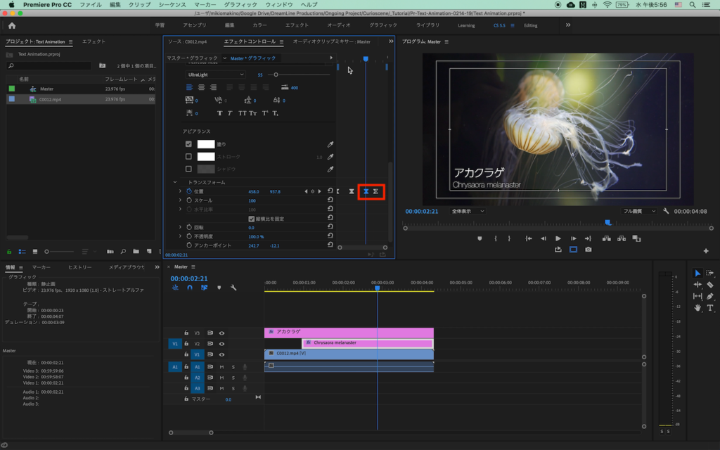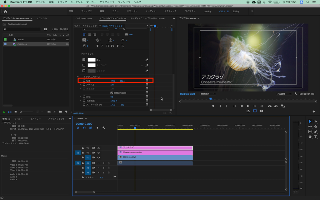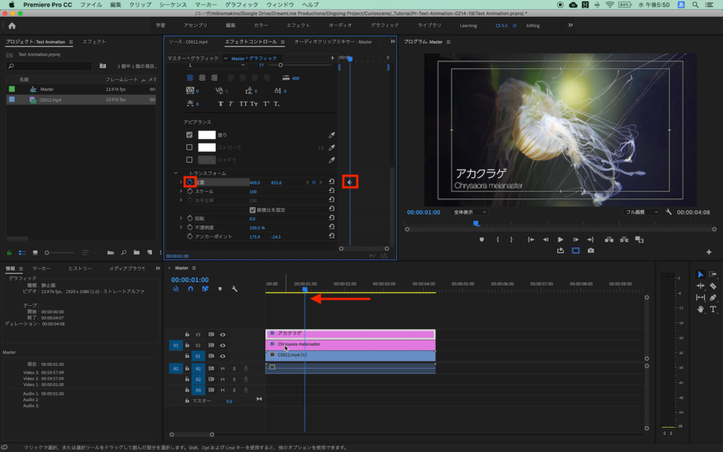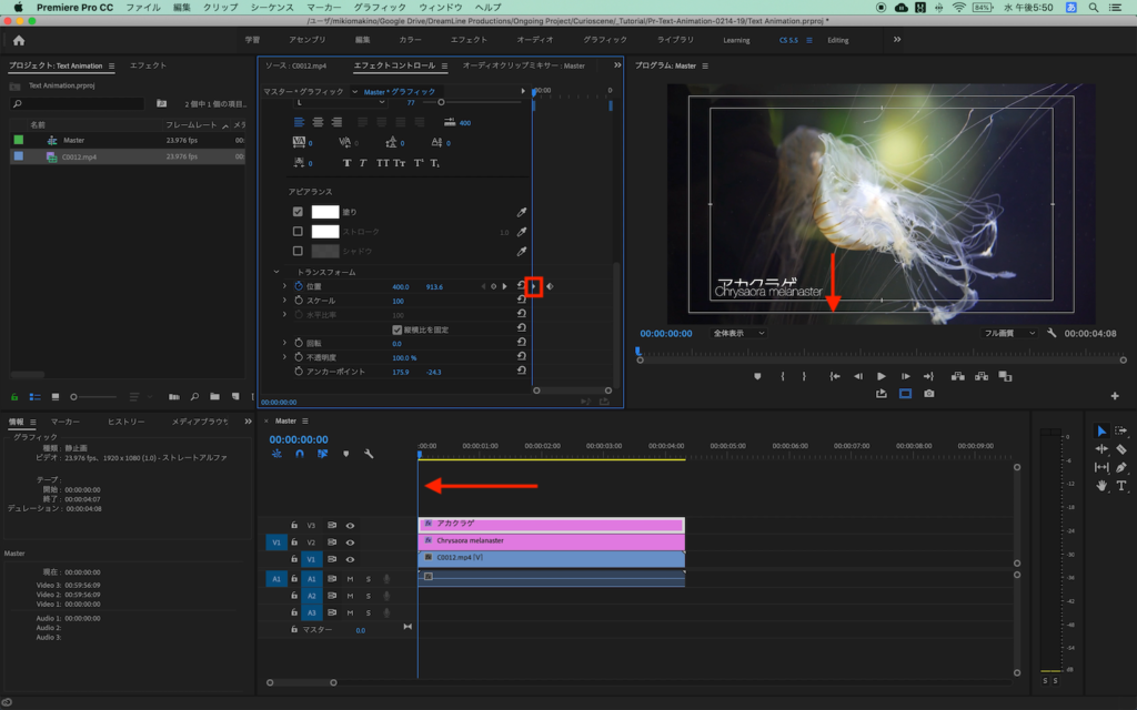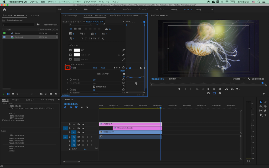 動きをつけるために今度はテキストにキーフレームを追加していきましょう。「アカクラゲ」のテキストレイヤーを選択して、「エフェクトコントロール」の「テキスト」内にある「トランスフォーム」、「位置」のプロパティを表示させます。