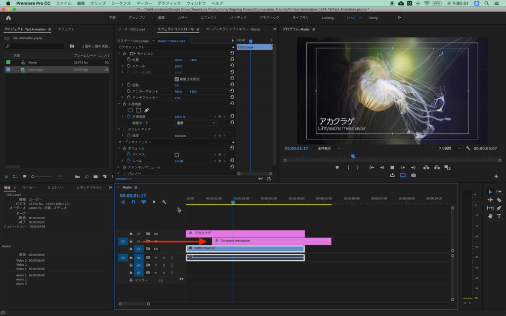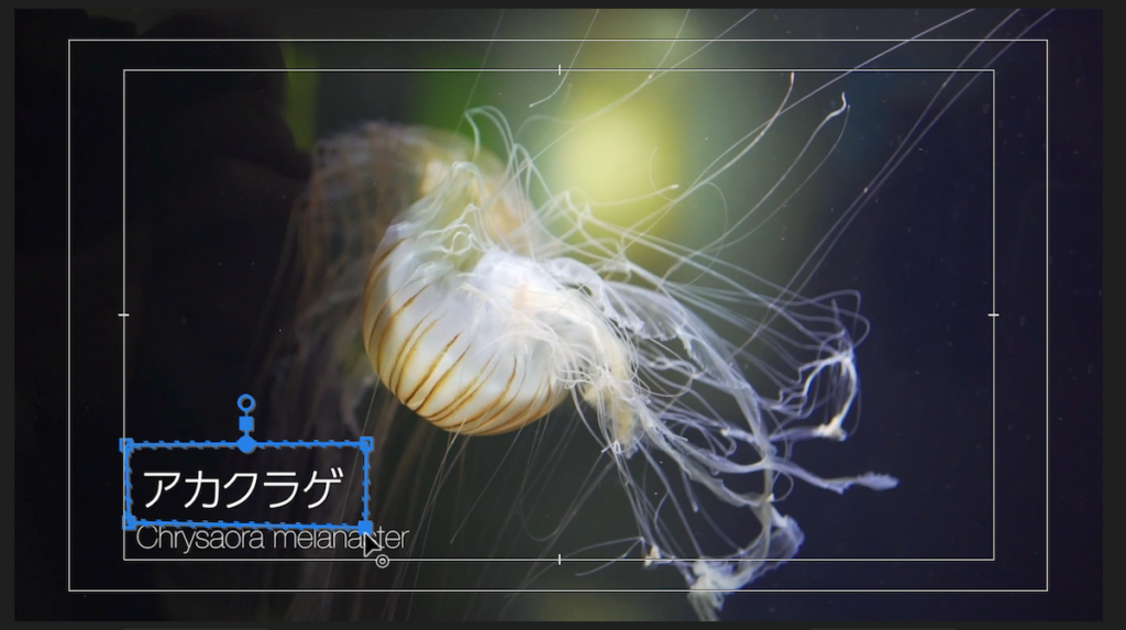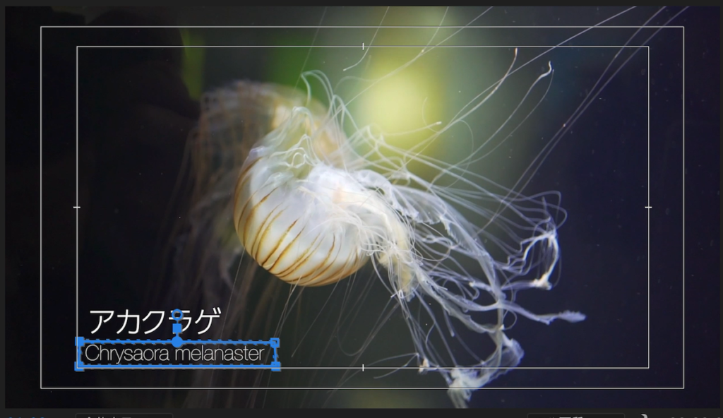 シンプルに何もない所から「アカクラゲ」のテキストが現れた後、英語名である「Chrysaora melanaster」が出てくるもの。テキストサイズを大きくしてタイトル、サブタイトルとして使用したり、今回の様にローワーサードとしても利用する事も可能です。