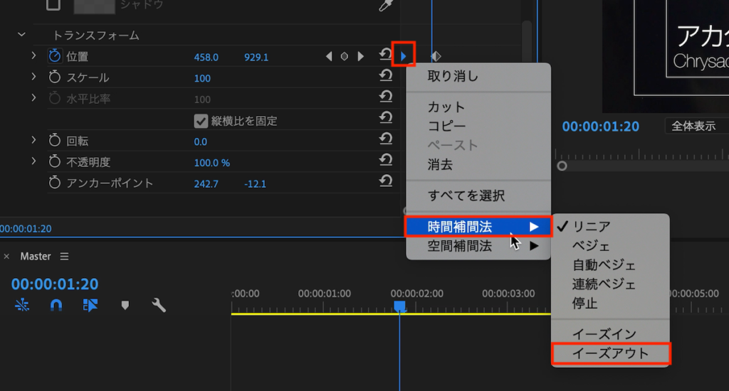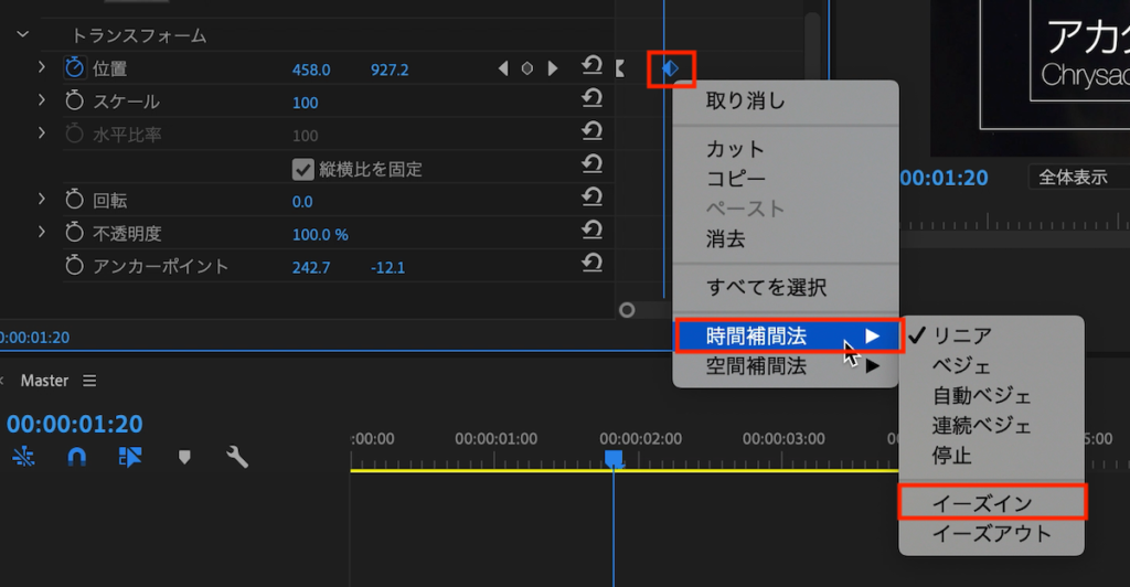 テキストレイヤーのキーフレームにイージングを加えていきます。テキストレイヤーの最初のキーフレームを選択して右クリック、「時間補間法」から「イーズアウト」、そして2つ目のキーフレームには「イーズイン」を選択します。