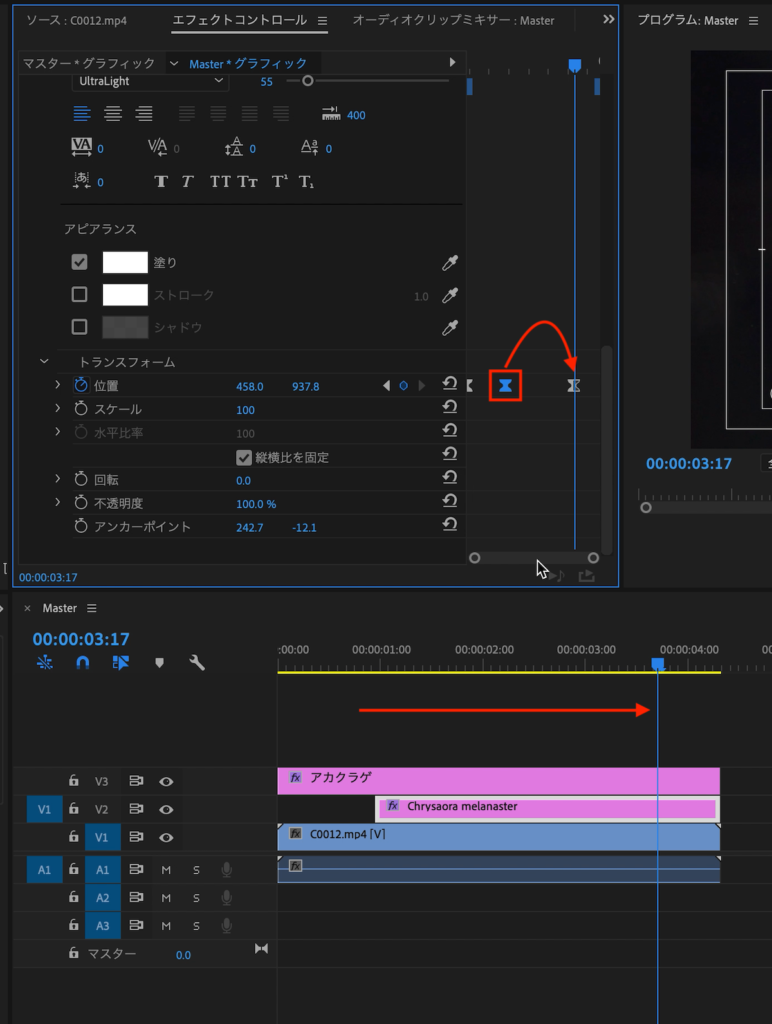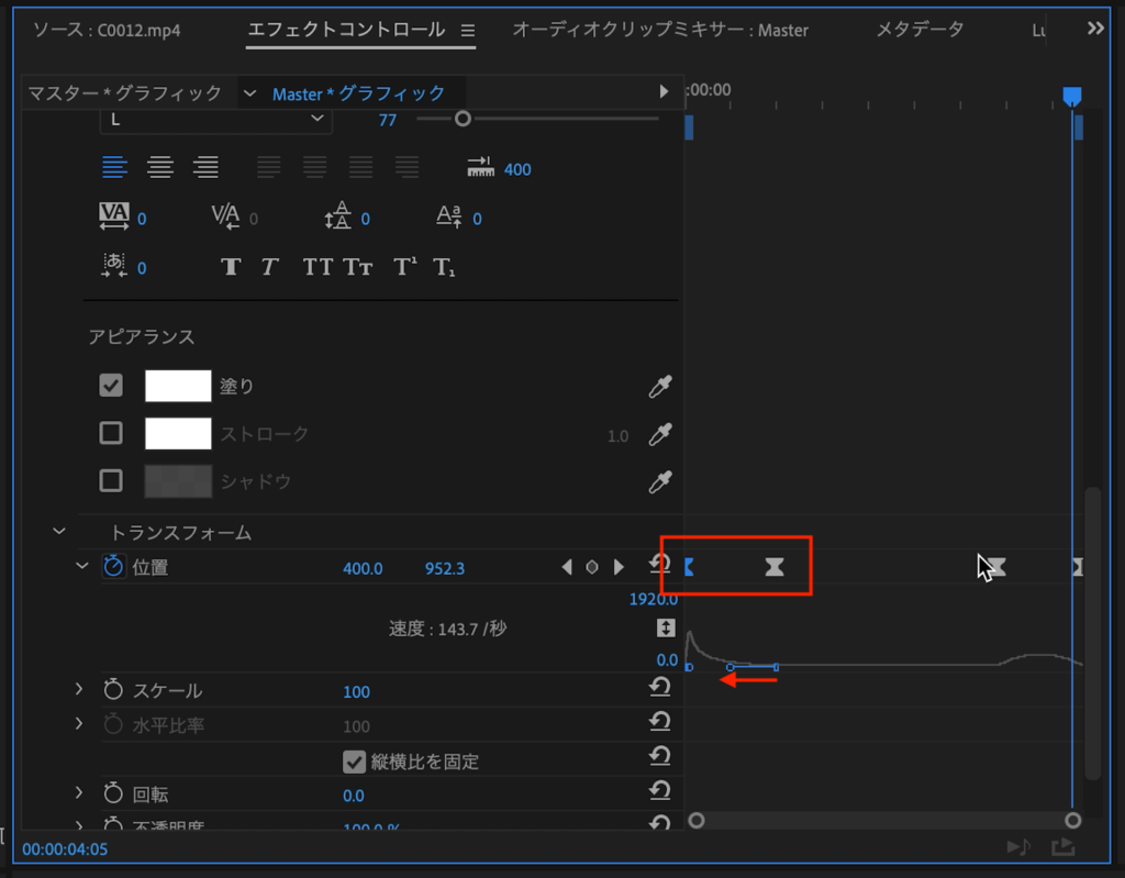 エフェクトコントロール内の「テキスト」、「位置」の横にある三角アイコンをクリックして、グラフを表示させます。