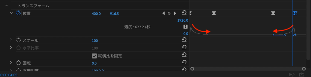 キーフレームを選択すると小さいですが、ハンドルが現れます。後は好きな方向にベジェ曲線を動かしていくだけ。筆者は最高速からゆっくりと減速するように調整していきました。