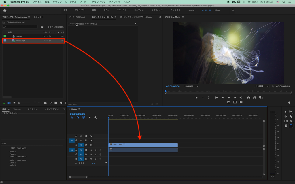 まずは背景となるクリップを追加し、シーケンスに読み込みます。今回のチュートリアルと同じ素材を使用したい方はこの記事の一番下にあるダウンロードボタンより素材を入手してください。