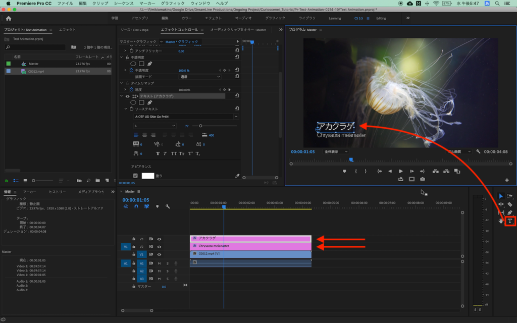 シーケンスを作成した後はツールバーにあるテキストツールを使って文字を追加してきます。今回は日本語と英語の2つを使用していますが、好みでデザインしていくと良いでしょう。