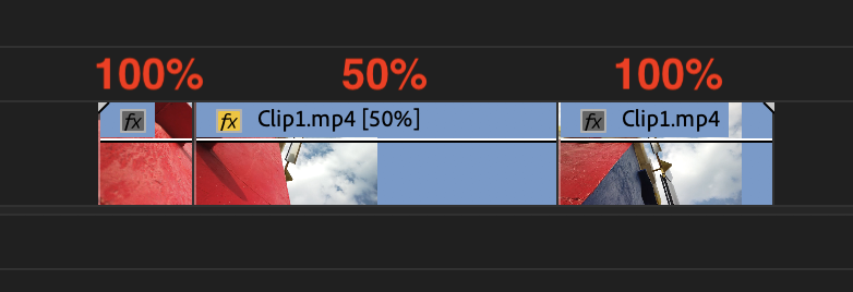 先述したPremiere Proの「速度」を使用する場合は一つのクリップをいくつかにトリムし、クリップの一部を「50%」に設定して変化を加えることができます。