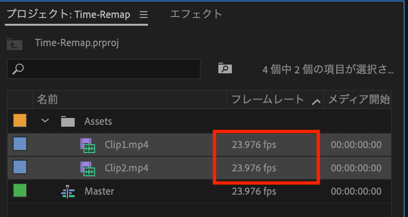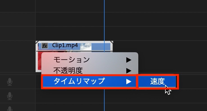 クリップの左上に「Fx」のアイコンがあるので、それを右クリックして、「タイムリマップ」内にある「速度」を選択しましょう。