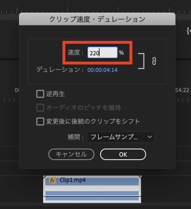 編集時に23.976fpsに変換し、本来の通常スピードに戻したい場合は速度を「220%」に設定しましょう。