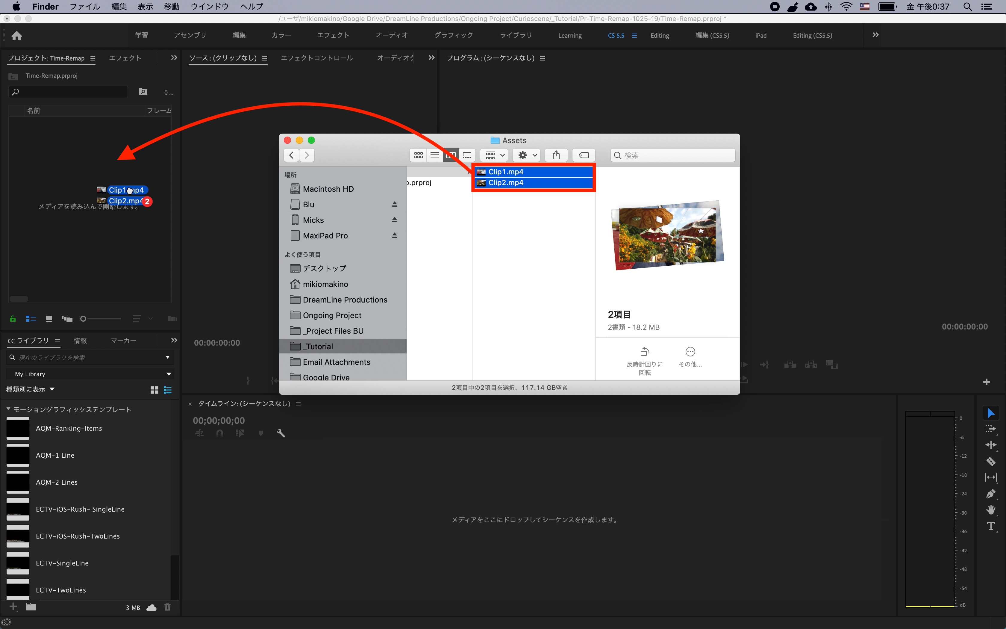 クリップをPremiere Proに読み込み、シーケンスを作成します。