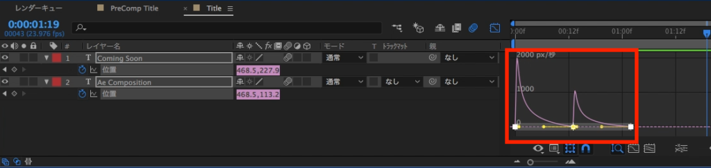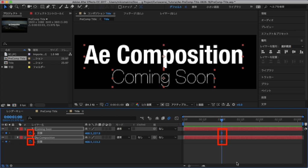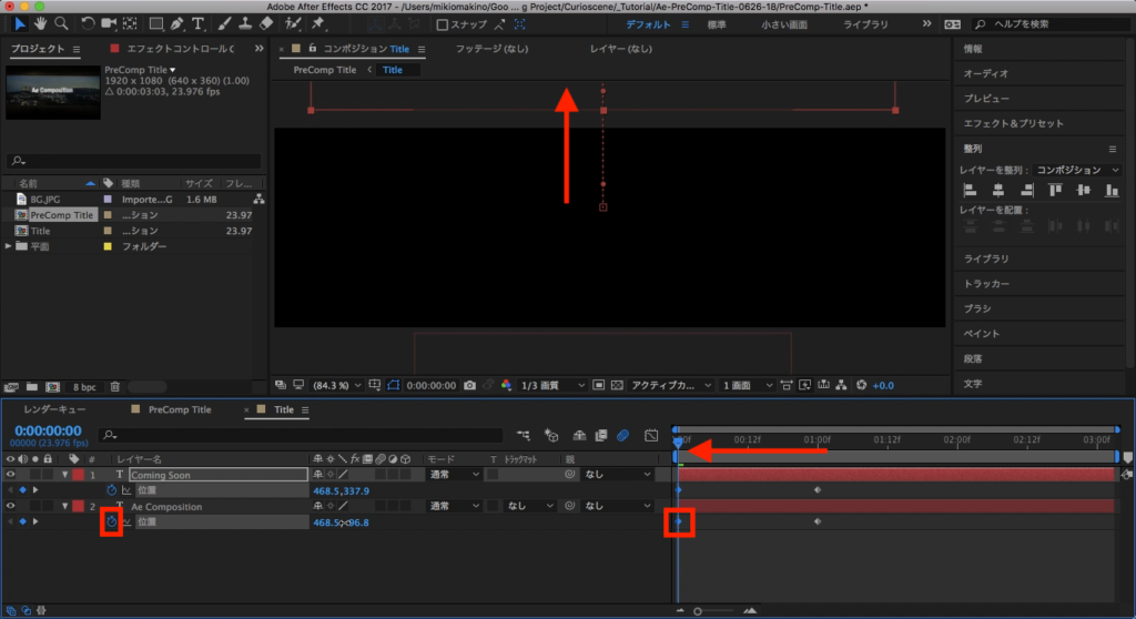 そして0秒に移動させて、「Coming soon」は下から、「Ae Composition」は上から現れるようにコンポジション上で操作するか、位置のY軸の数値を変更させてキーフレームを追加します。