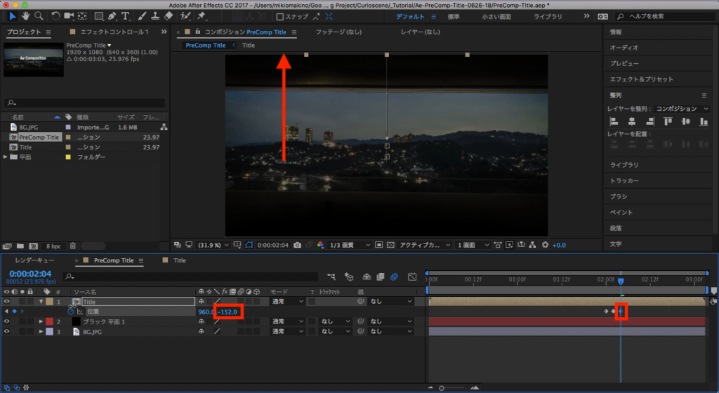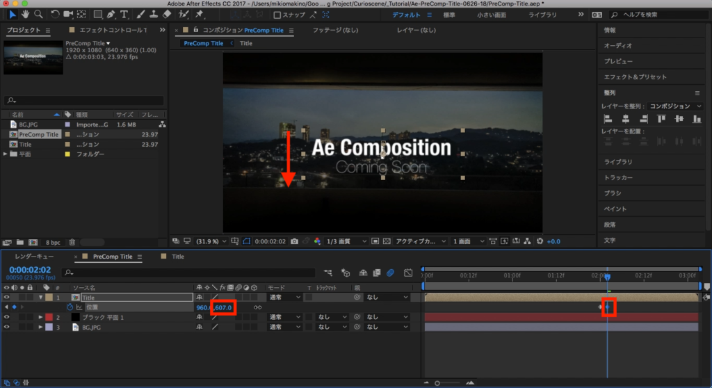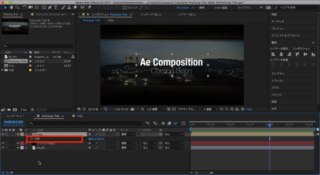ここまでくればアニメーションが一通り完了する訳ですが、もう一つ面白い演出があれば良いと思ったので、タイトルが上に退場するという演出を付け加えてみましょう。メインコンポジションに戻り、先程作成したプリコンポジションのレイヤーを選択し、位置のプロパティを表示させます。