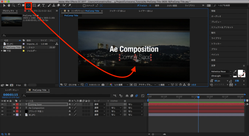 上部ツールバーにあるテキストツールを使用して、メインタイトルとサブタイトルを追加していきましょう。筆者の場合は「Ae Composition」、「Coming Soon」という映画のタイトルっぽい感じにしてみました。