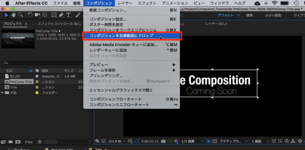 目標範囲を指定した後は、上部メニューの「コンポジション」から「コンポジションを目標範囲にクロップ」をクリックしてコンポジションのサイズを変更します。