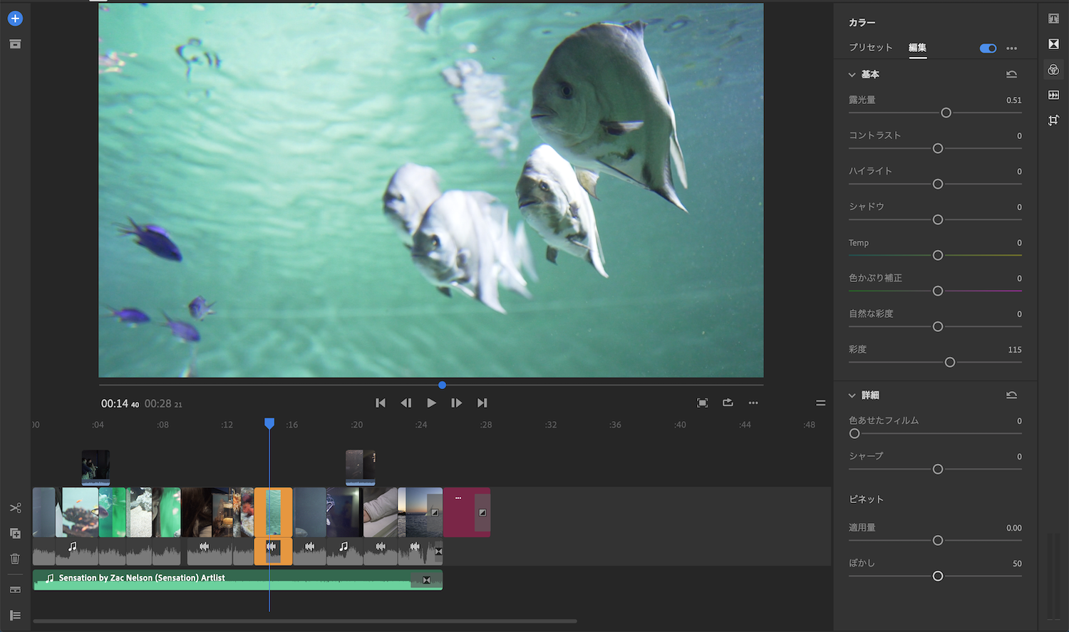 Premiere Proに比べると機能がだいぶ省かれていますが、シーケンスや色補正などのツールはPremiere Proと同じように使えます。直感的に編集ができるため、初心者には優しい編集アプリではあるものの、キーフレームやキーイングなどのエフェクトが含まれていないので、物足りなく感じる可能性があります。