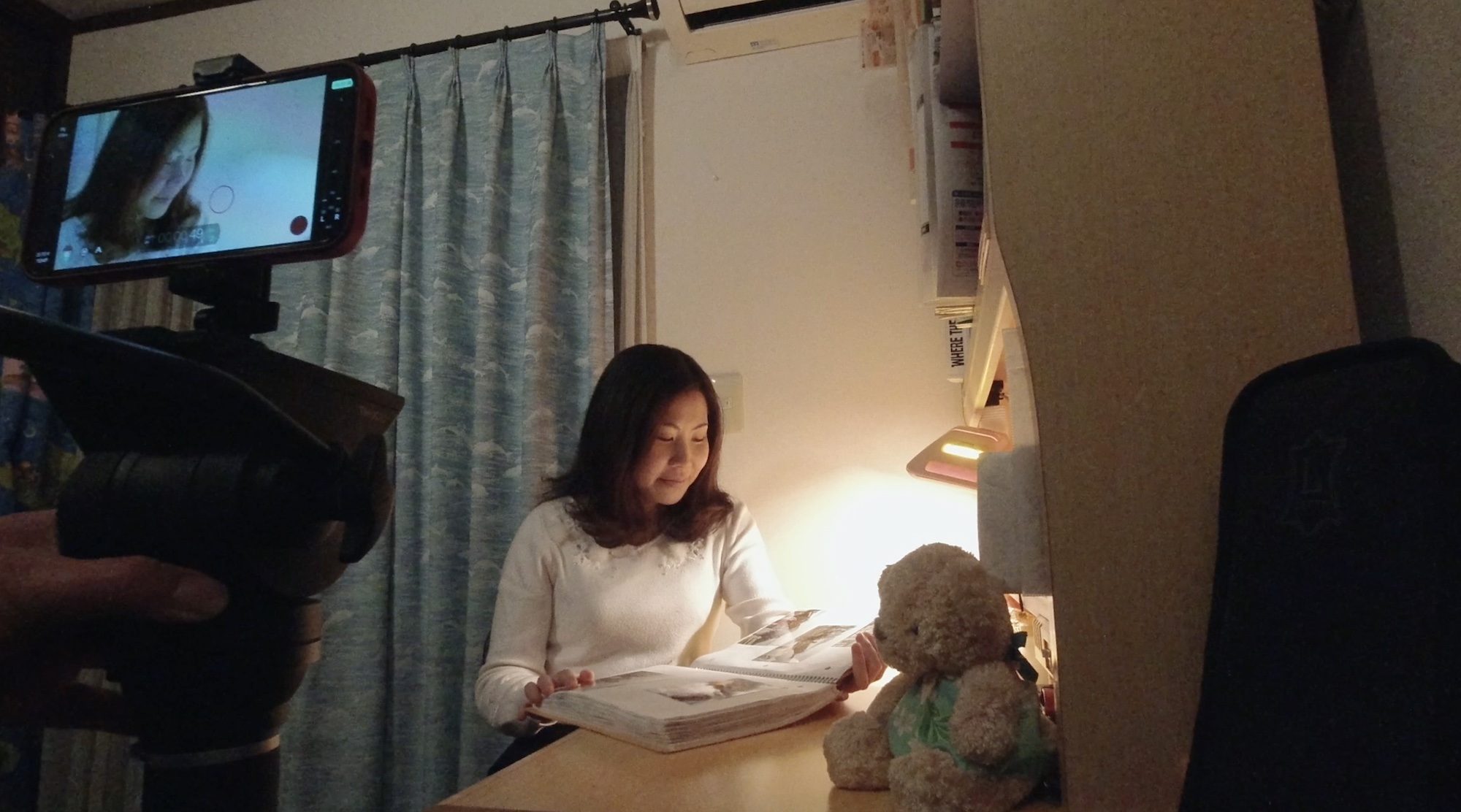 主人公がアルバムを眺めるシーンでは夜行いました。先程のリビングのシーンと違って光源が限られているのでテーブルライトとLED照明を活用して撮影していきます。