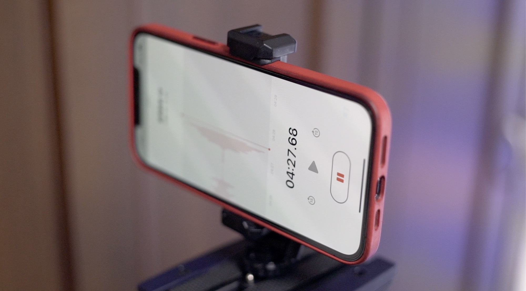 本来はブームマイクまたはワイヤレスマイクを使って収録するセリフシーンですが、iPhoneでのマイク性能をチェックするため、内蔵マイクを使ってセリフとナレーションを収録しました。