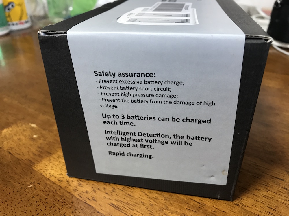 横のパッケージによると同時充電はできないものの、最大3つのバッテリーを充電することができます。