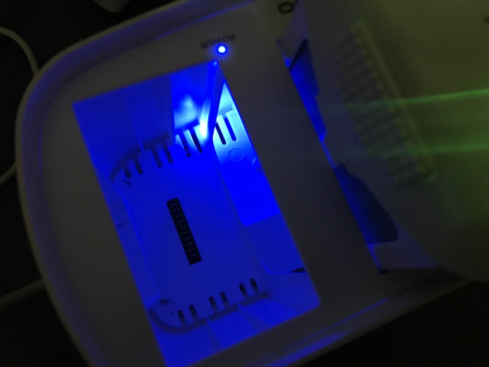 実際に充電してみるとこんな感じ。本体の上部には「Power」というインディケーターが用意されており、電源に繋ぐと青く光るのでカッコイイ感じでした。