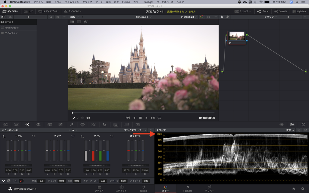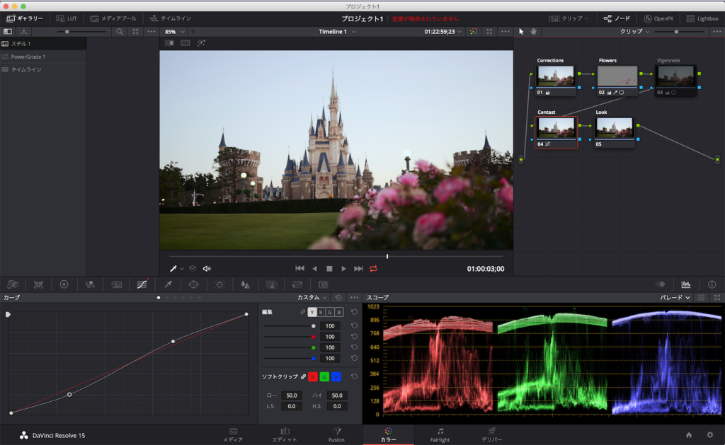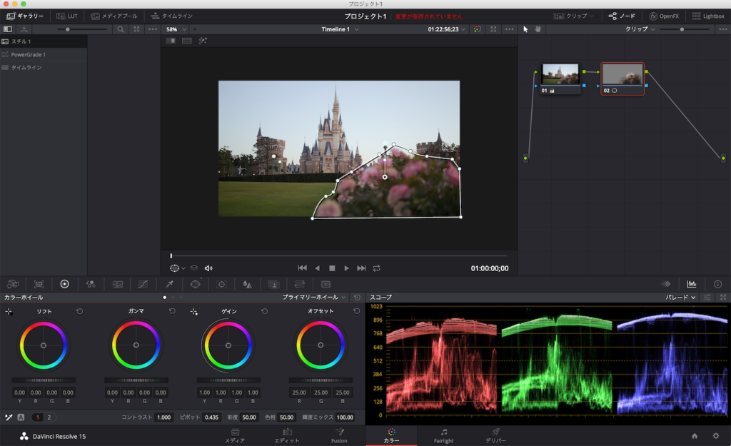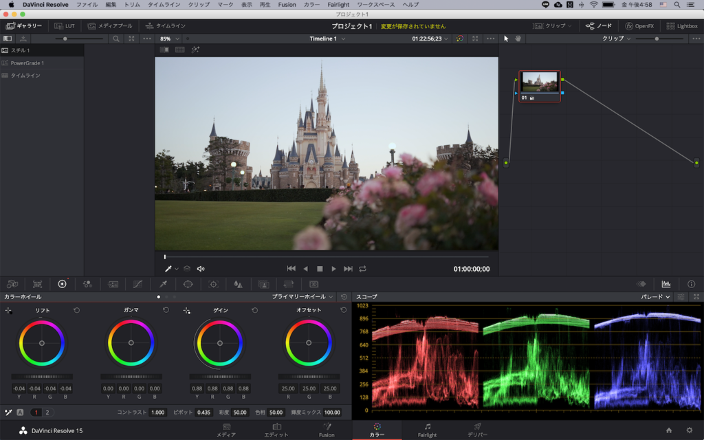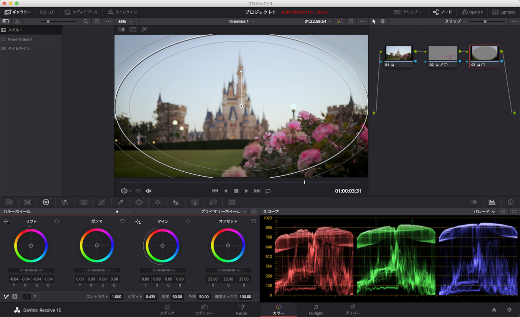 主にRGBパレードまたは波形を確認しながら、露光量やカラーホイールのシャドウ、ミッドトーン、ハイライトから明るさを調整していきます。