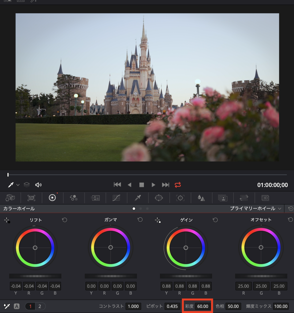 不自然ではない程度に彩度を調整していきます。LOG撮影されている場合は、メーカーによって推奨する彩度があると思うので、それに合わせてみるというのも良いでしょう。