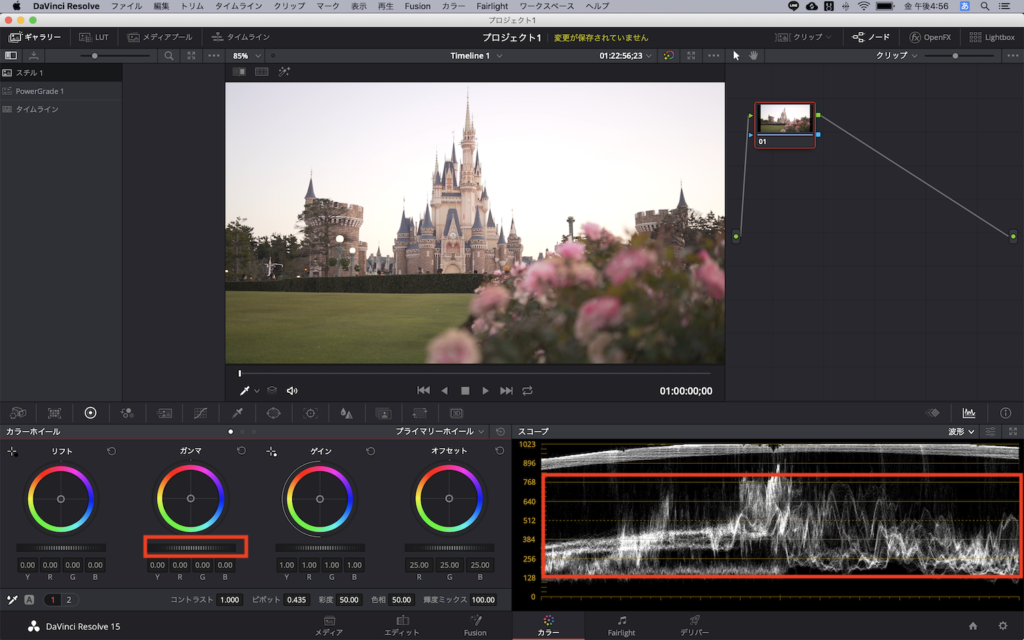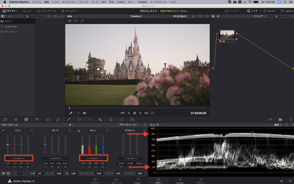 今回の例では波形の一番上が「896」辺りにゲイン(ハイライト)を調整し、リフト(シャドウ)では「256」辺りになるように調整していきました。