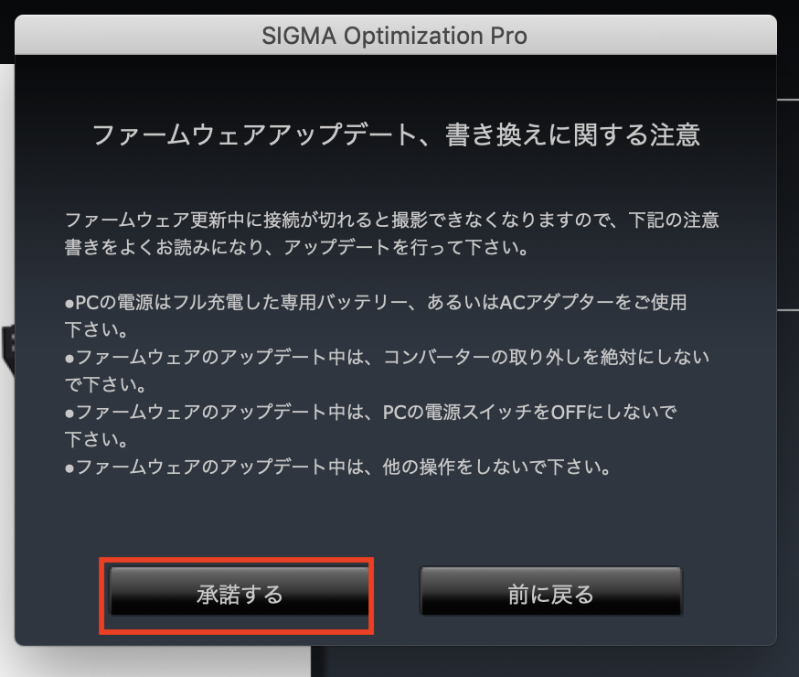 アップデートする際はパソコンの電源が切れてしまうと失敗する可能性があるので、充電器に接続しながら行うと良いでしょう。注意書きを一通り読んで問題がなければ「承諾する」をクリック。