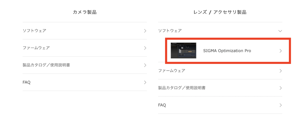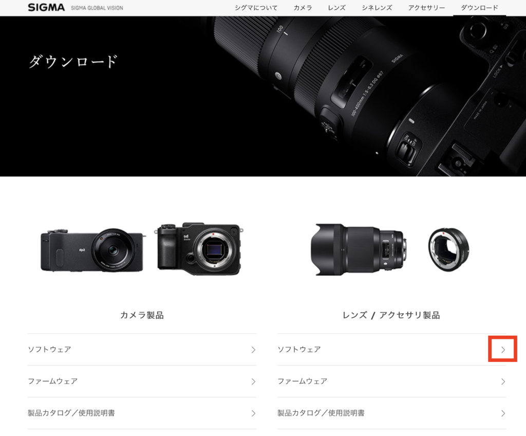 まずSIGMAのダウンロードページにアクセスし、「レンズ・アクセサリ製品」内の「>」アイコンをクリックし中身を展開します。