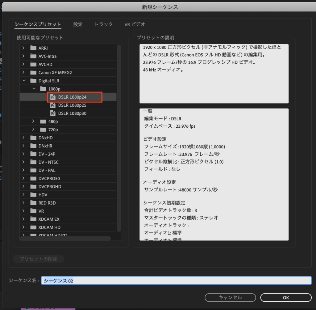 アニメーションを自作するにはPremiere Proが必要です。Premiere Proを開き、新規プロジェクトとシーケンスを作成しましょう。筆者のシーケンス設定では「DSLR 1080 24p」にしています。
