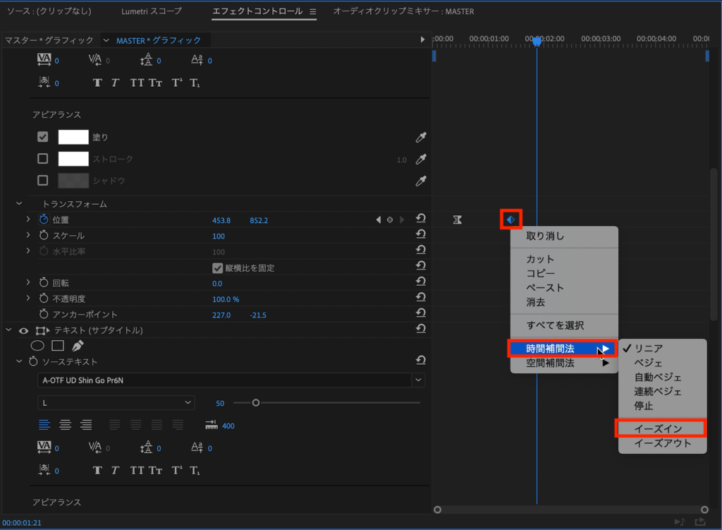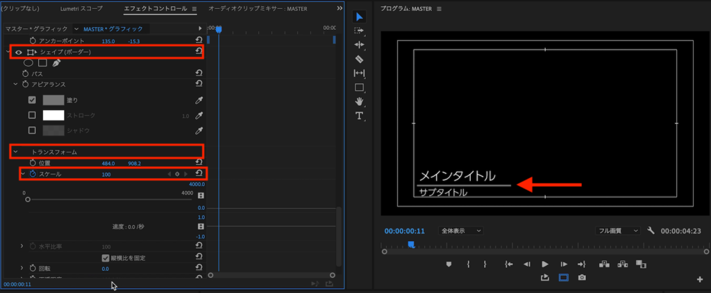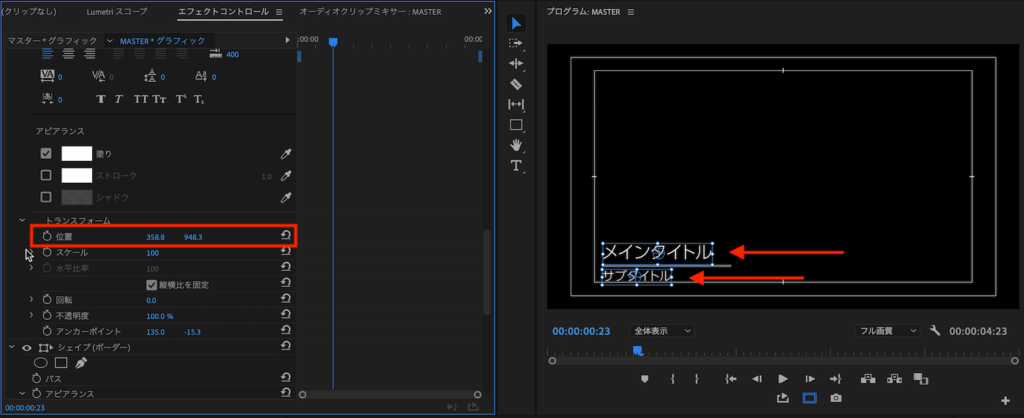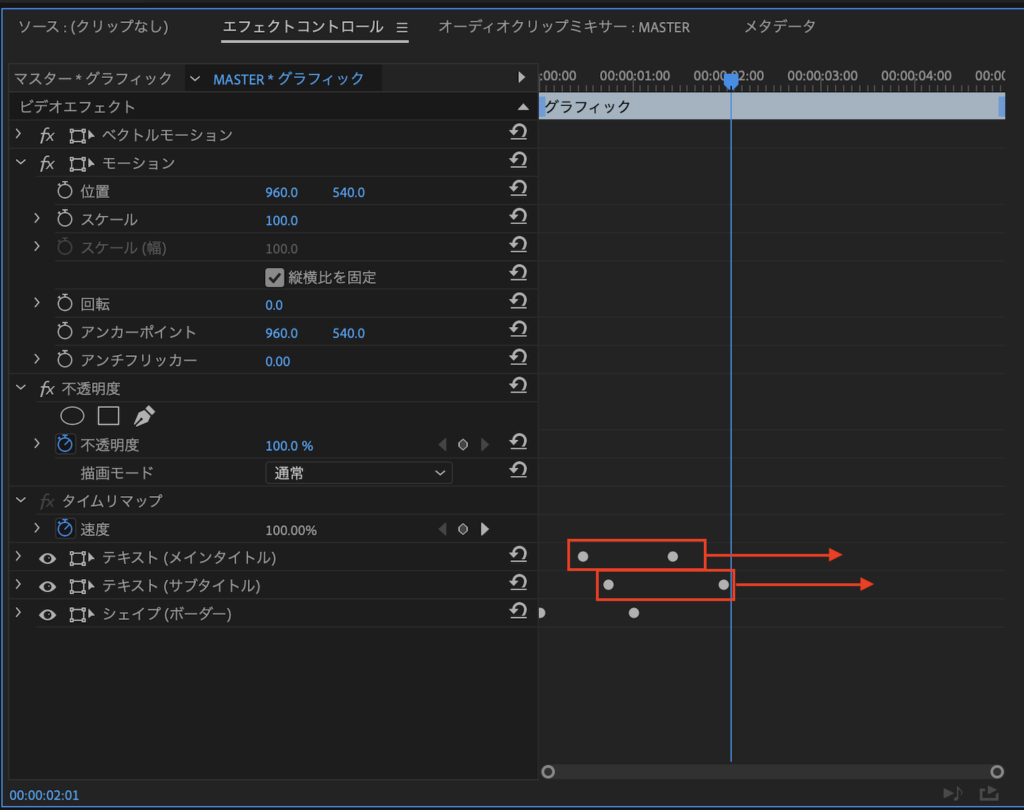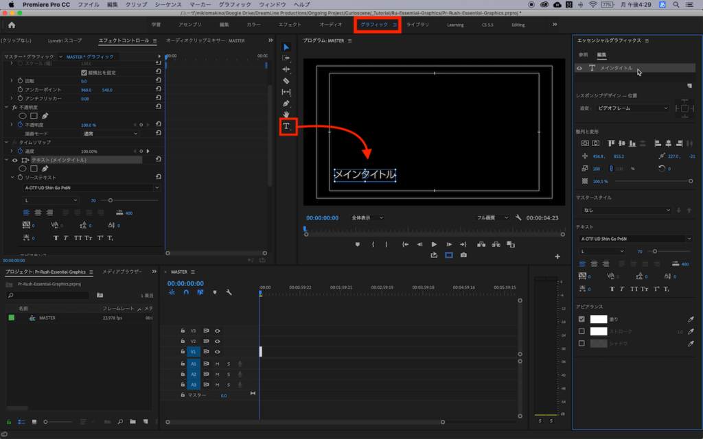 今回はシンプルに「位置」と「スケール」のプロパティを使用してテキストアニメーションを作ります。ちなみに筆者は操作がしやすいように、Premiere Proの表示モードを「グラフィック」にしています。