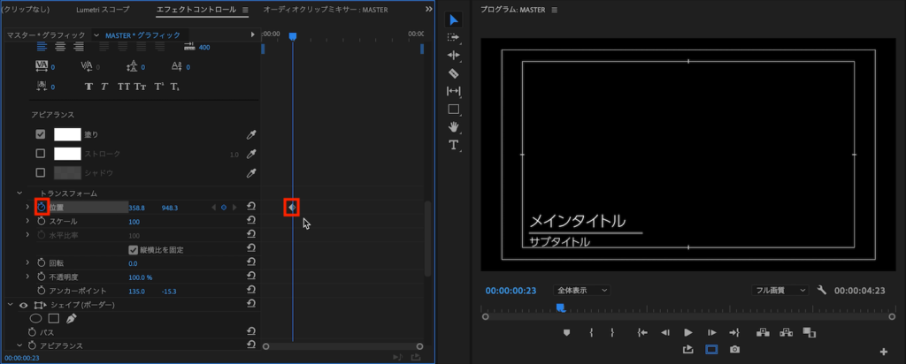 次にテキストです。メインタイトルとサブタイトルの「位置」をストップウォッチアイコンをクリックして現在の状態をキーフレームに保存します。