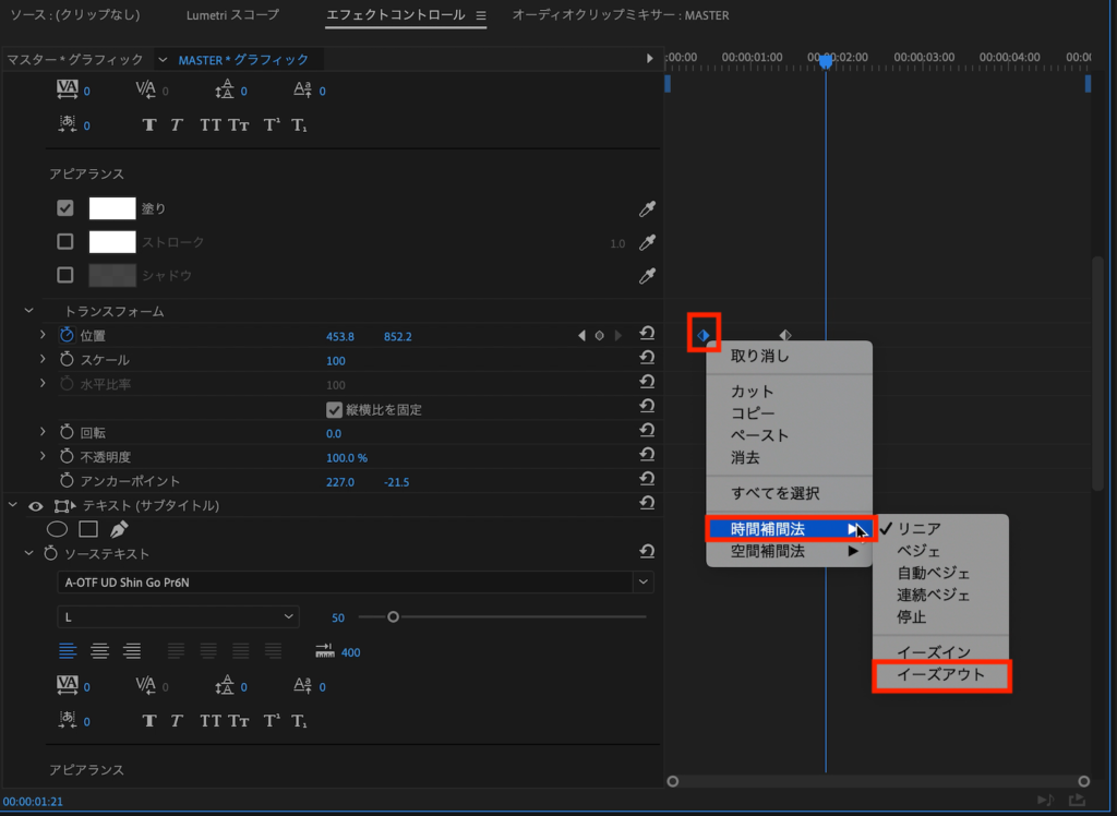 そして自然なアニメーションにするために、最初のキーフレームを選択して右クリック、「時間補間法」、「イーズアウト」。最後のキーフレームには「イーズイン」を選択して、イージングを加えます。