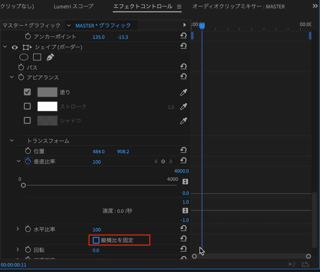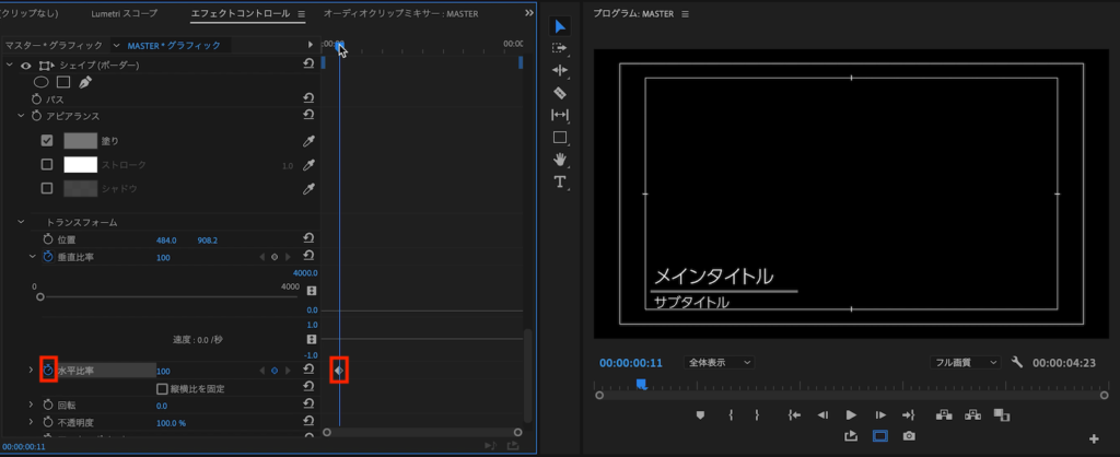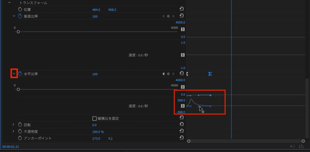 その中にある「縦横比を固定」のチェックを外し、「水平比率」のストップウォッチアイコンをクリックして、現在の状態をキーフレームに保存します。
