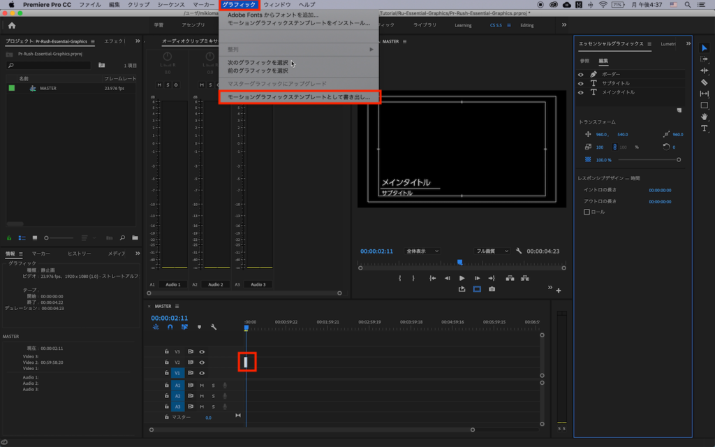 こちらの記事に書いてあるのと同じ様に、シーケンス上にあるモーショングラフィックスを選択して、上部メニュー、「グラフィック」から「モーショングラフィックステンプレートとして書き出し」を選択して、エッセンシャルグラフィックスとして保存します。